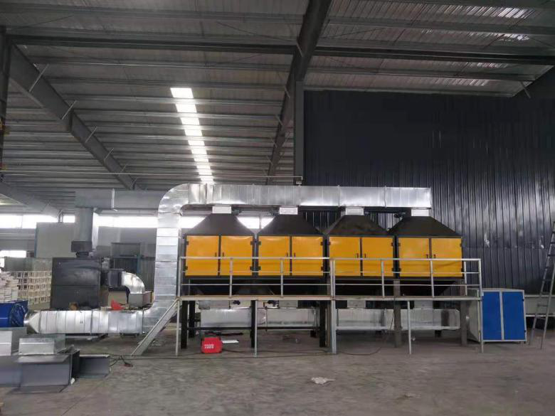 废气由吸尘罩收集,吸尘罩的大小根据废气源的大小来制作,在通过管道在引风机的作用下进入催化燃烧设备处理。为避免颗粒状漆雾影响后续的活性炭吸附过程,尾气先进入干式预过滤处理装置,将尾气中的颗粒状污染物截留下来,再进入活性炭吸附床进行吸附处理,废气中的气态有机污染物被吸附在活性炭表面,而干净的气流沿管道高空排放。经过一段时间的吸附,活性炭对污染物吸附达到一定的程度后,启动系统的活性炭脱附再生过程,将原来吸附在活性炭里的有机废气脱附出来,通过催化燃烧将气态有机污染物转化成二氧化碳和水蒸汽,经处理后的气流高空达标排放。待处理的有机废气由风管引出后进入干式过滤器将颗粒物尘杂去除后进入活性炭吸附床,根据风量的大小确定吸附床数量(可为一吸一脱或多吸一脱),可通过阀门来切换,使气体进入不同的吸附床,该吸附床是交替工作的,气体进入吸附床后,气体中的有机物质被活性炭吸附而着附在活性炭的表面,从而使气体得以净化,净化后的气体再通过风机排向大气。