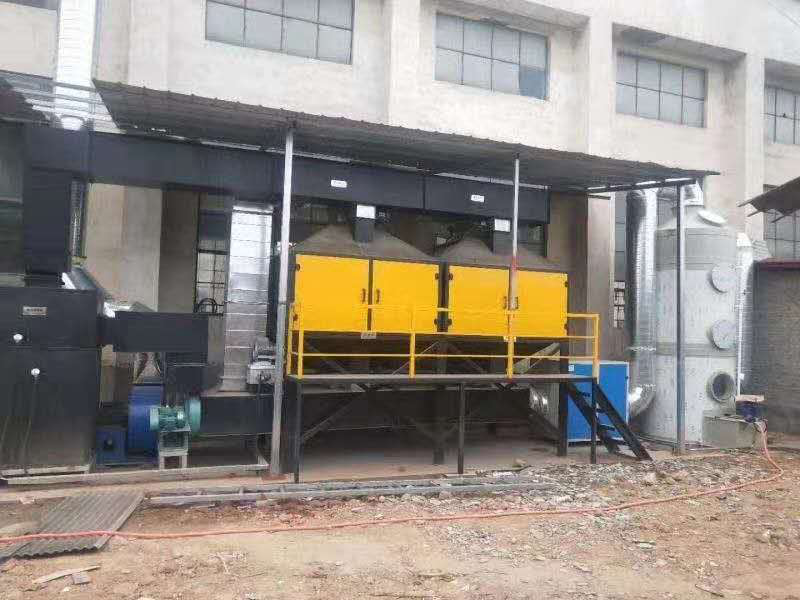 废气由吸尘罩收集,吸尘罩的大小根据废气源的大小来制作,在通过管道在引风机的作用下进入催化燃烧设备处理。为避免颗粒状漆雾影响后续的活性炭吸附过程,尾气先进入干式预过滤处理装置,将尾气中的颗粒状污染物截留下来,再进入活性炭吸附床进行吸附处理,废气中的气态有机污染物被吸附在活性炭表面,而干净的气流沿管道高空排放。经过一段时间的吸附,活性炭对污染物吸附达到一定的程度后,启动系统的活性炭脱附再生过程,将原来吸附在活性炭里的有机废气脱附出来,通过催化燃烧将气态有机污染物转化成二氧化碳和水蒸汽,经处理后的气流高空达标排放。待处理的有机废气由风管引出后进入干式过滤器将颗粒物尘杂去除后进入活性炭吸附床,根据风量的大小确定吸附床数量(可为一吸一脱或多吸一脱),可通过阀门来切换,使气体进入不同的吸附床,该吸附床是交替工作的,气体进入吸附床后,气体中的有机物质被活性炭吸附而着附在活性炭的表面,从而使气体得以净化,净化后的气体再通过风机排向大气。