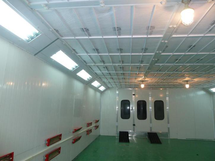 3.4 烤漆房:房体封闭式设计,采用50mm岩棉防火保温夹芯板,采用壁厚2.0mm40mm*60mm镀锌方管焊接工字梁链接房体结构。采用电热热风机加热,温度可控,常温-60℃选择电热热风机电热热风机18KW安装简单,接好电源线即可使用,升温速度快,在40平方米的房体内3-5分钟可达到30-50度,室内升温均匀,循环热风可吹到6-8米 经济实用:加温能耗平均低于普通的各种红外线加热管烤漆房能耗的50%以上。(*高使用温度60℃)电源线由购买方架设到设备接线柱。